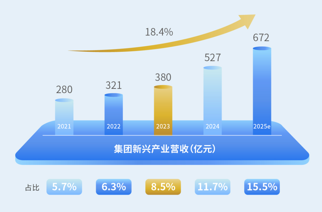 集团新兴产业营收快速增长,复合增长率达18.4%,占集团营收比例达11.6%,若计入重要参资企业营收,占比达15.5%。